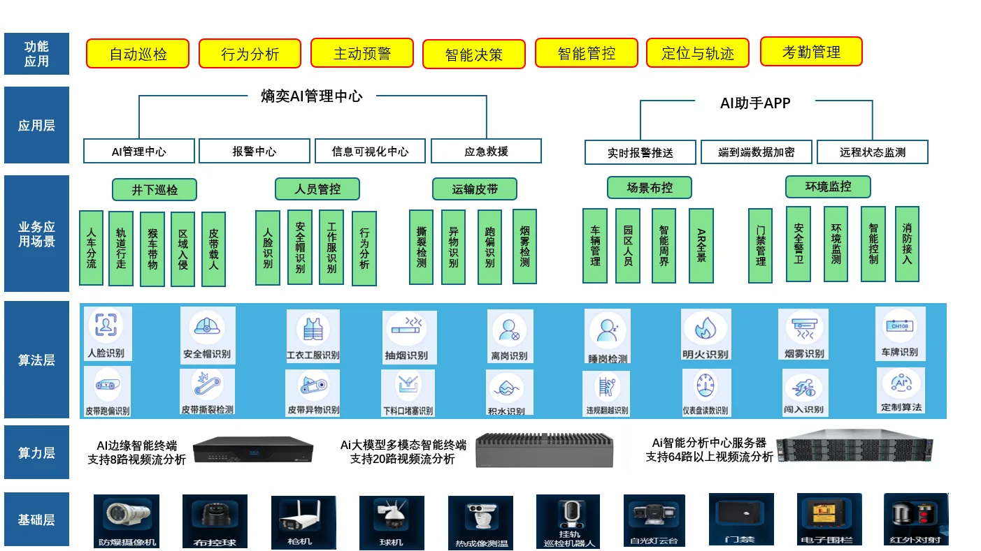 科技进步的今天,矿山安全事故仍然高发,给人民生命财产和社会维稳工作带来严峻挑战。国家矿山安监局和地方各省市陆续出台文件推动矿山重大风险防控,推动矿业行业向智能化、数字化浪潮转型。为此,熵奕信息深入矿业行业调研了解需求和应用场景,智慧矿山AI分析解决方案应运而生。该方案方案深度融合计算机视觉(CV)、边缘计算(Edge Computing)、物联网(IoT)及大数据分析等核心技术,通过对矿山全域视频监控网络的智能化升级与重构,构建“感、知、管、控”一体的矿山智能视觉中枢,全方位捕捉设备运行状态、人员作业行为、环境变化等信息,利用AI算法模型对这些海量视频进行快速精准识别与分析,从根本上推动矿山管理从被动响应、经验驱动向主动预警、数据决策的模式跨越,实现矿山生产的安全、高效、绿色运行。