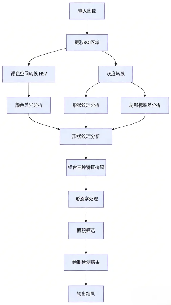 三大特征掩码并非独立工作,而是经过加权融合与形态学优化,形成综合异常概率图。后续流程包括: